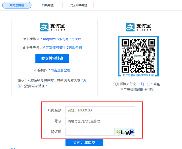 第六步:在您充值成功以后,請(qǐng)您在“淘鋪王支付寶充值頁(yè)面”填寫您的充值金額及充值賬號(hào),并且點(diǎn)擊提交。