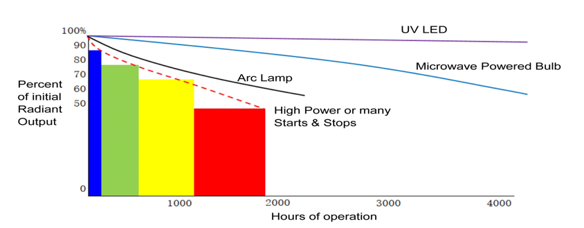 1、汞燈UV 光照強(qiáng)度衰減快(1500H)